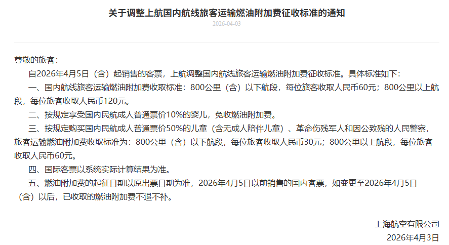 4月3日,东方航空、上海航空相继发布通知,自2026年4月5日(含)起销售的客票,调整国内航线旅客运输燃油附加费征收标准。