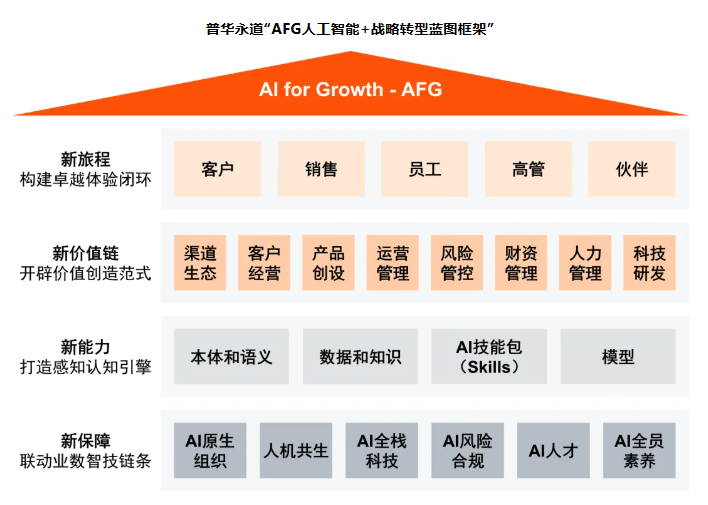 普华永道根据政策精神、发展趋势、行业实践及项目经验,设计了企业“人工智能+”战略转型的蓝图和实施方法:建议企业加强“AI For Growth(AFG)”顶层战略设计,采用“五维五阶实施法”落地转型举措,对内实现“既要让AI跑得快,又要让AI跑得稳”,对外实现AI赋能全国智能经济和智能社会建设。