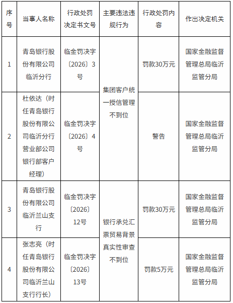 【大河财立方消息】4月3日,国家金融监督管理总局临沂监管分局披露的行政处罚信息显示,因集团客户统一授信管理不到位,青岛银行临沂分行被罚30万元,时任该行营业部公司银行部客户经理杜依达被警告;因银行承兑汇票贸易背景真实性审查不到位,青岛银行临沂兰山支行被罚30万元,时任该行行长张志亮被罚5万元。