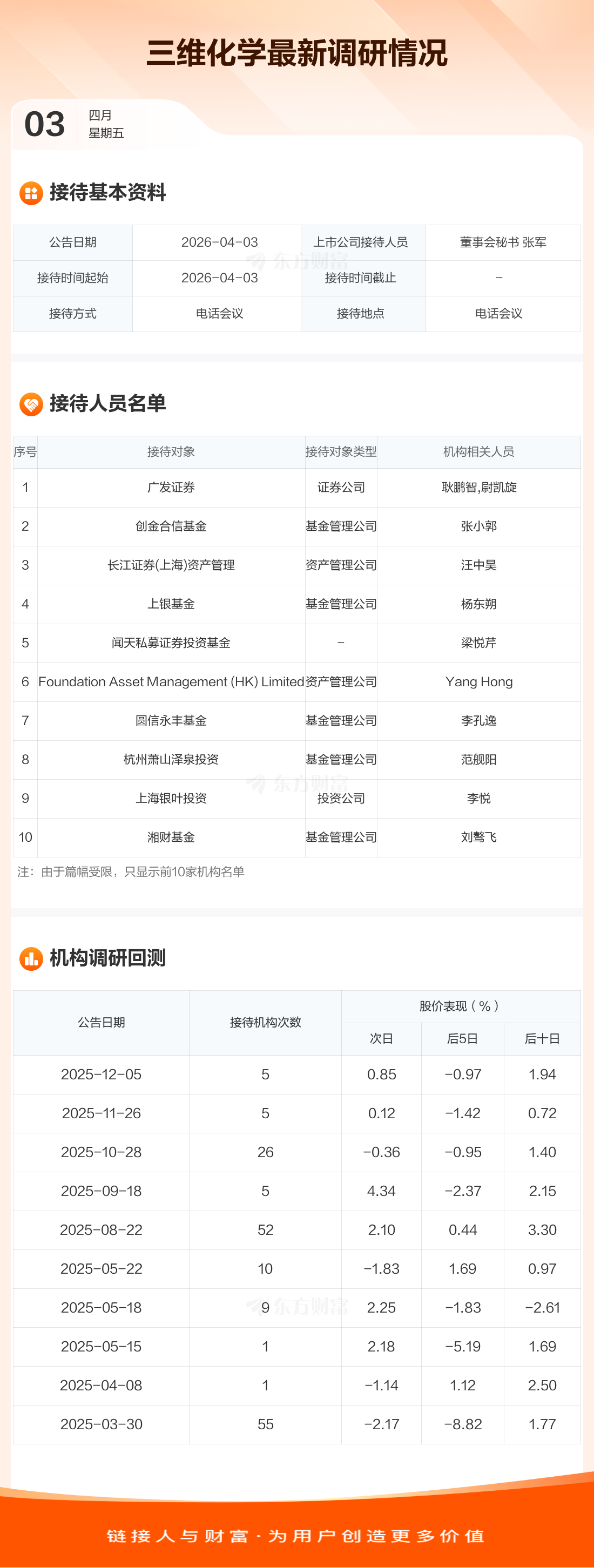 三维化学4月3日公告称,4月3日接待广发证券等31家机构调研。接待人员包括董事会秘书 张军。