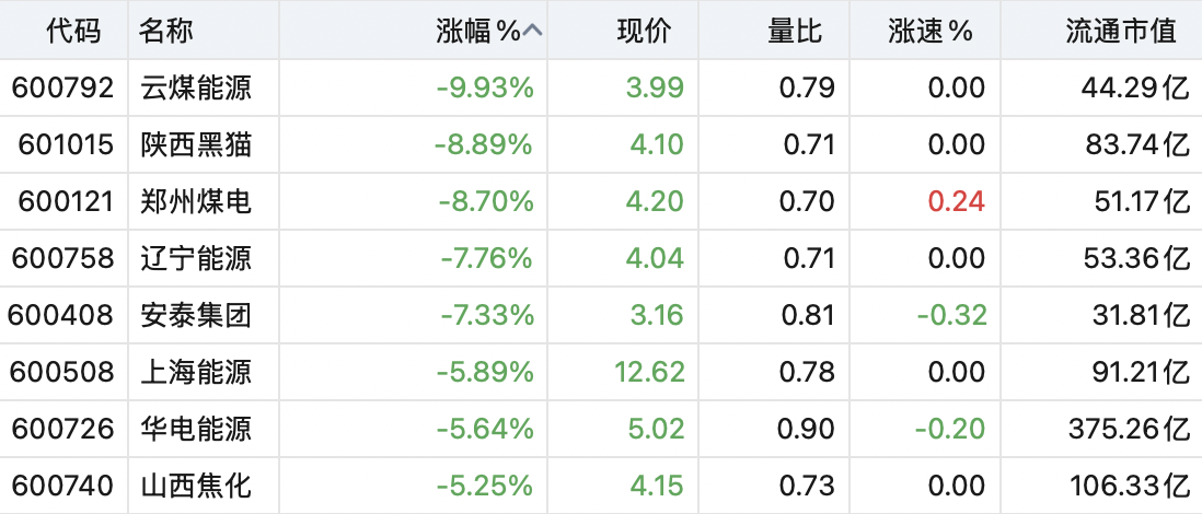 煤炭板块持续走弱,云煤能源跌停,陕西黑猫、郑州煤电跌超8%,辽宁能源、安泰集团跌超7%。