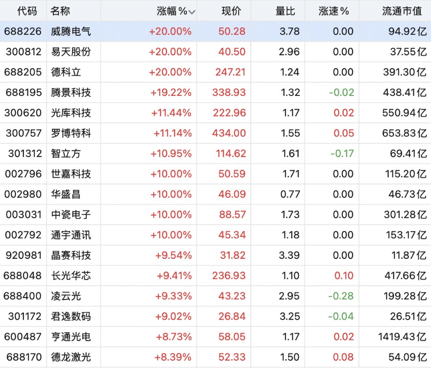 具体来看,CPO板块中,威腾电气、易天股份、德科立20%涨停,腾景科技、光库科技涨超10%,世嘉科技、华盛昌、中瓷电子、通宇通讯等多股涨停。