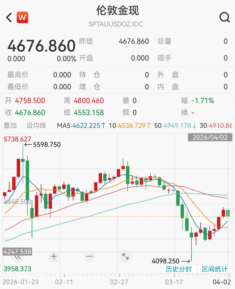 北京时间4月3日凌晨,金价止步四连涨,现货黄金收跌1.71%,报4676.86美元/盎司;COMEX黄金期货跌2.29%,维持在4700美元上方。