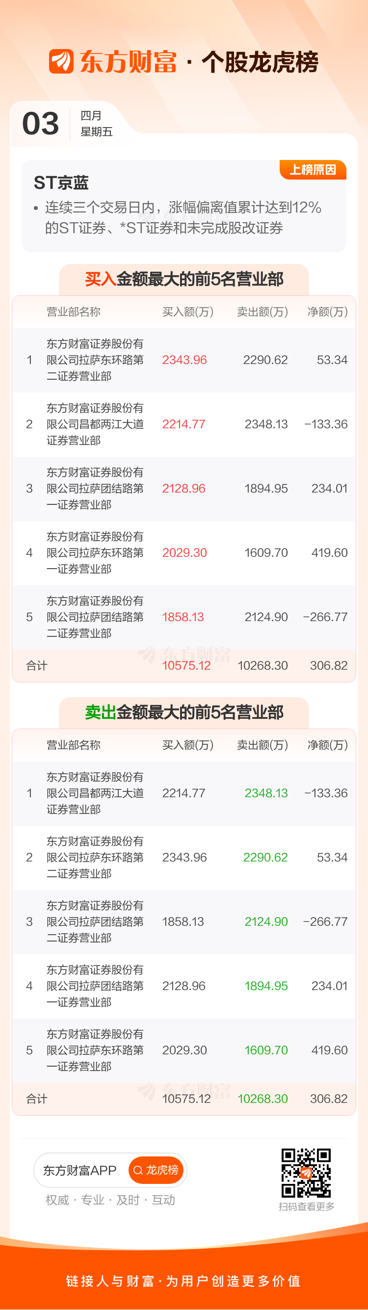 交易所2026年4月3日公布的交易公开信息显示,ST京蓝因成为连续三个交易日内,涨幅偏离值累计达到12%的ST证券、*ST证券和未完成股改证券上榜。ST京蓝当日收报4.13元,涨跌幅5.09%,换手率9.94%,成交额9.52亿。异常期间4月2日至4月3日,期间涨幅10.43%,累计偏离值13.49%,区间成交额15.41亿。