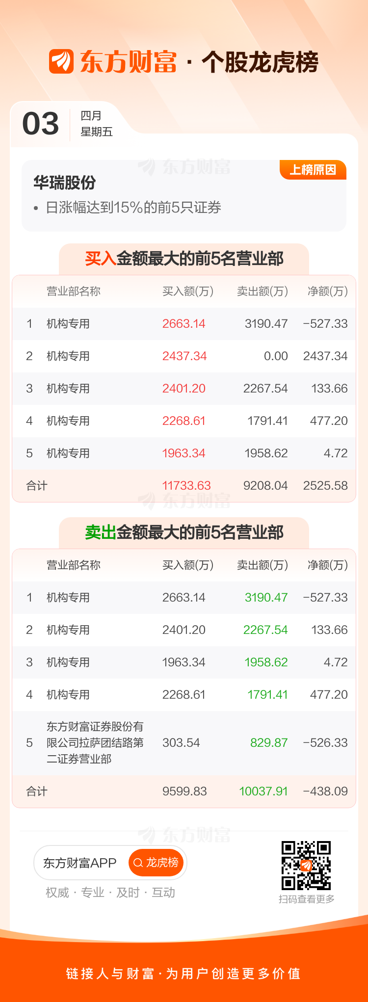 交易所2026年4月3日公布的交易公开信息显示,华瑞股份因成为日涨幅达到15%的前5只证券上榜。华瑞股份当日收报24.59元,涨跌幅20.01%,偏离值20.00%,换手率17.17%,成交额7.40亿。