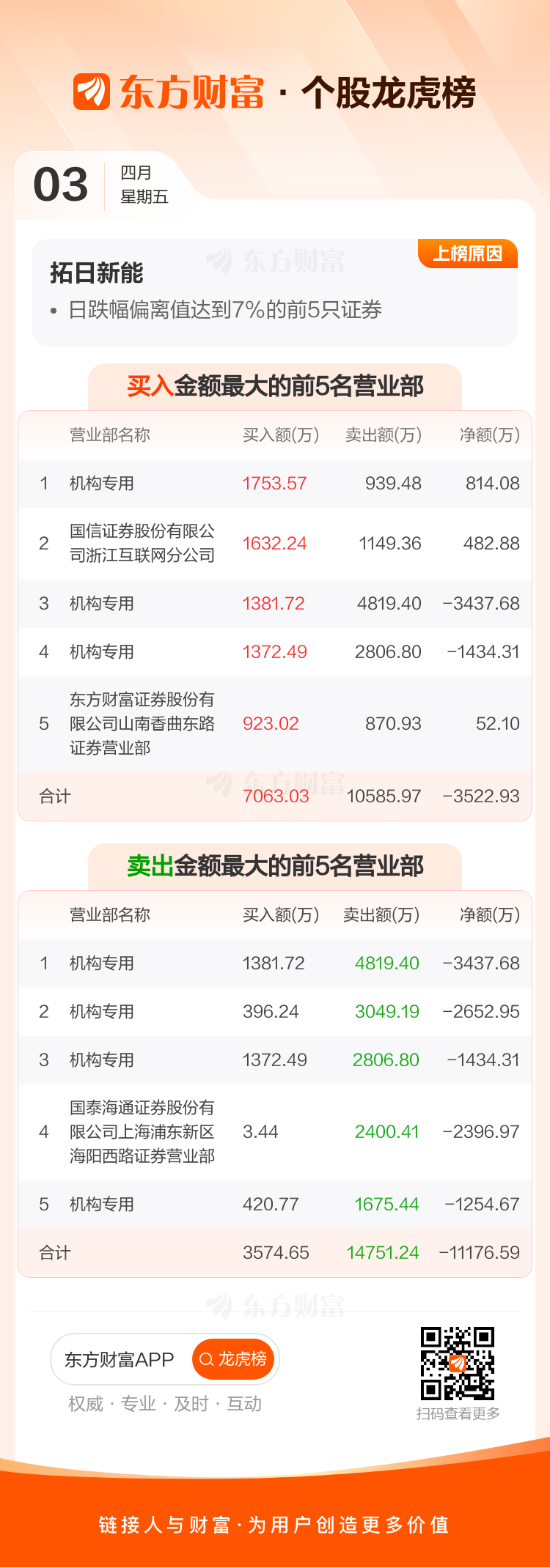交易所2026年4月3日公布的交易公开信息显示,拓日新能因成为日跌幅偏离值达到7%的前5只证券上榜。拓日新能当日收报5.89元,涨跌幅-9.94%,偏离值-8.51%,换手率15.38%,成交额12.89亿。