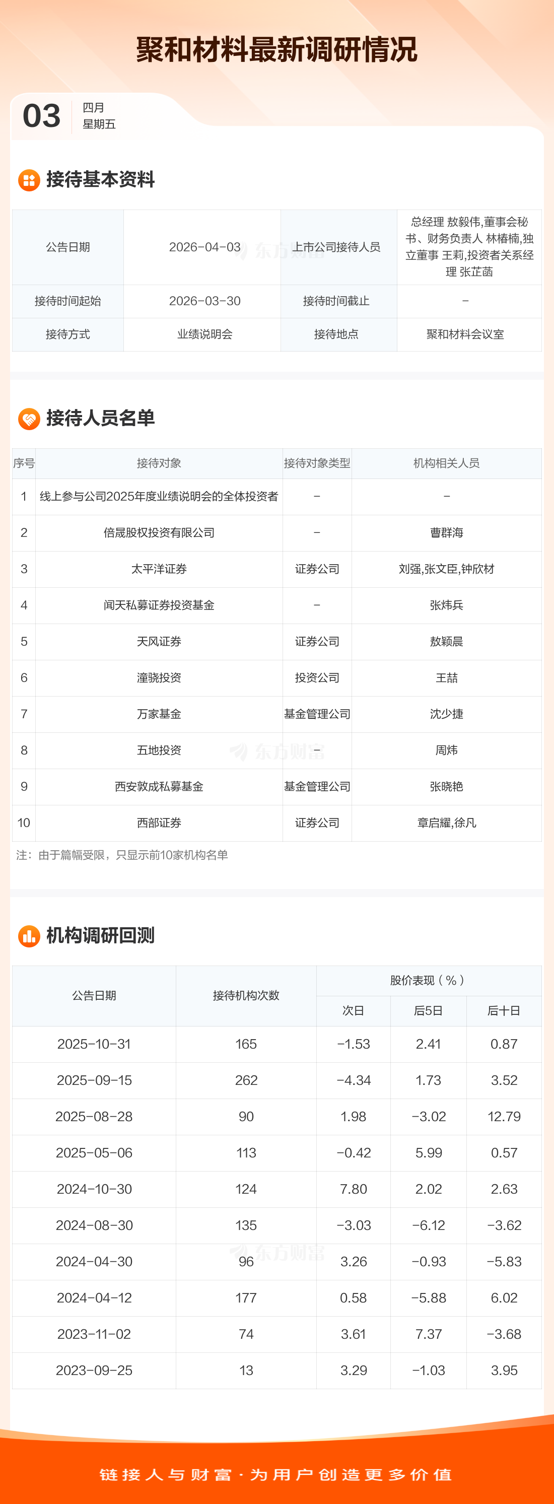 聚和材料4月3日公告称,3月30日接待线上参与公司2025年度业绩说明会的全体投资者等142家机构调研。接待人员包括总经理 敖毅伟,董事会秘书、财务负责人 林椿楠,独立董事 王莉,投资者关系经理 张芷菡。