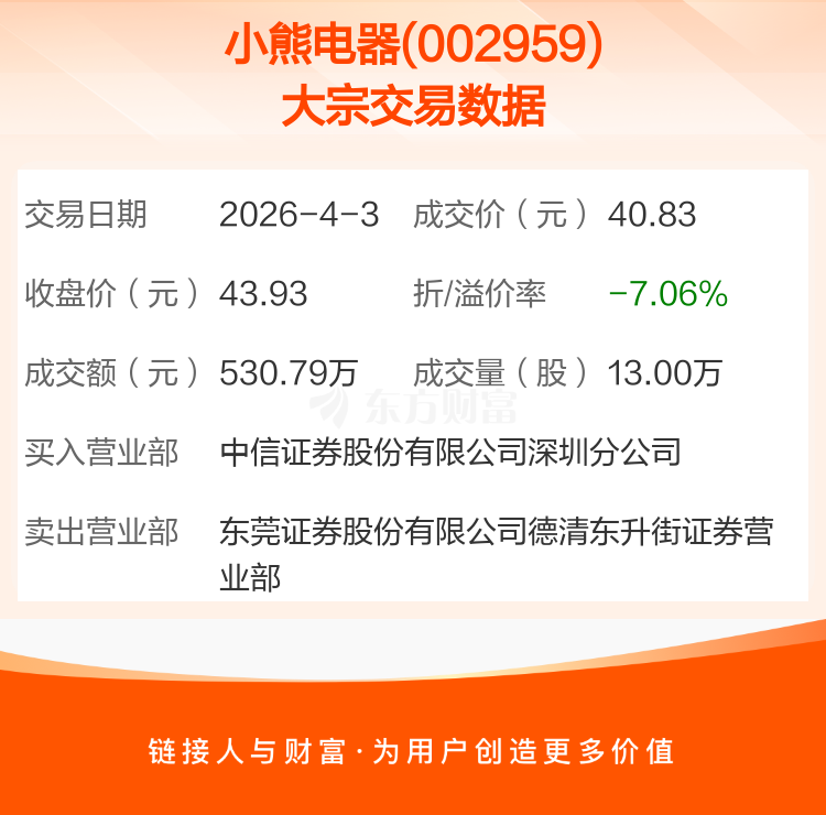 2026年4月3日,小熊电器发生1笔大宗交易,共成交13.00万股,成交金额530.79万元,占其流通市值比例为0.08%。