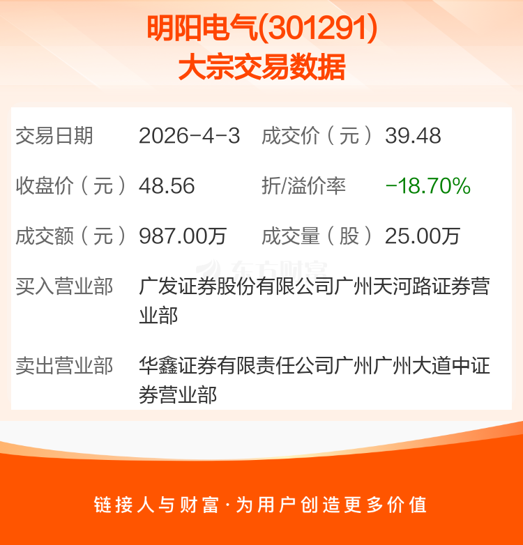 2026年4月3日,明阳电气发生1笔大宗交易,共成交25.00万股,成交金额987.00万元,占其流通市值比例为0.13%。