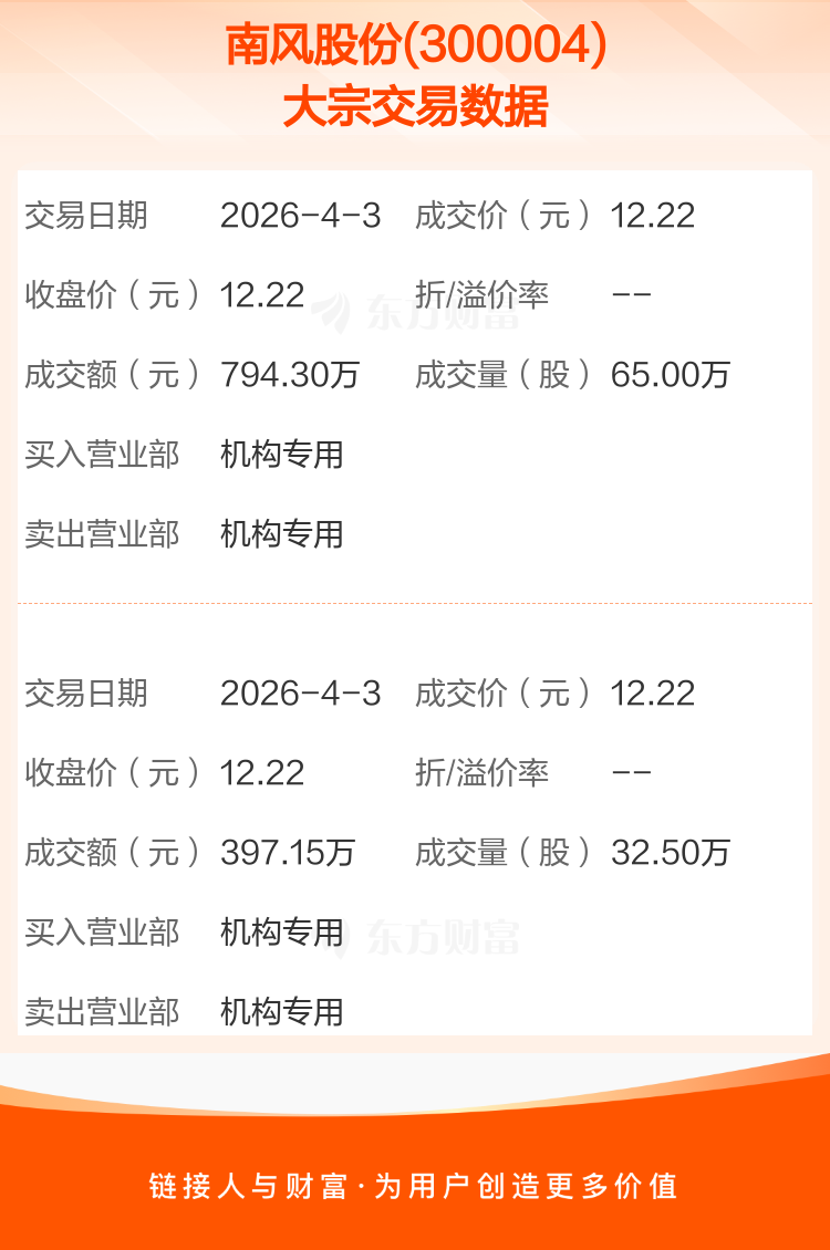 2026年4月3日,南风股份发生2笔大宗交易,共成交97.50万股,成交金额1191.45万元,占其流通市值比例为0.20%。