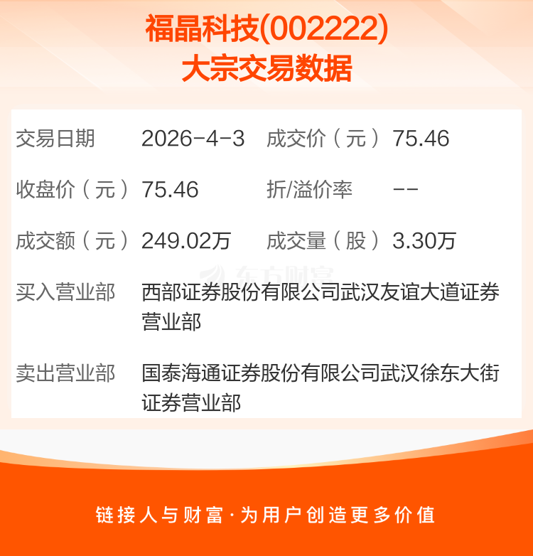 2026年4月3日,福晶科技发生1笔大宗交易,共成交3.30万股,成交金额249.02万元。