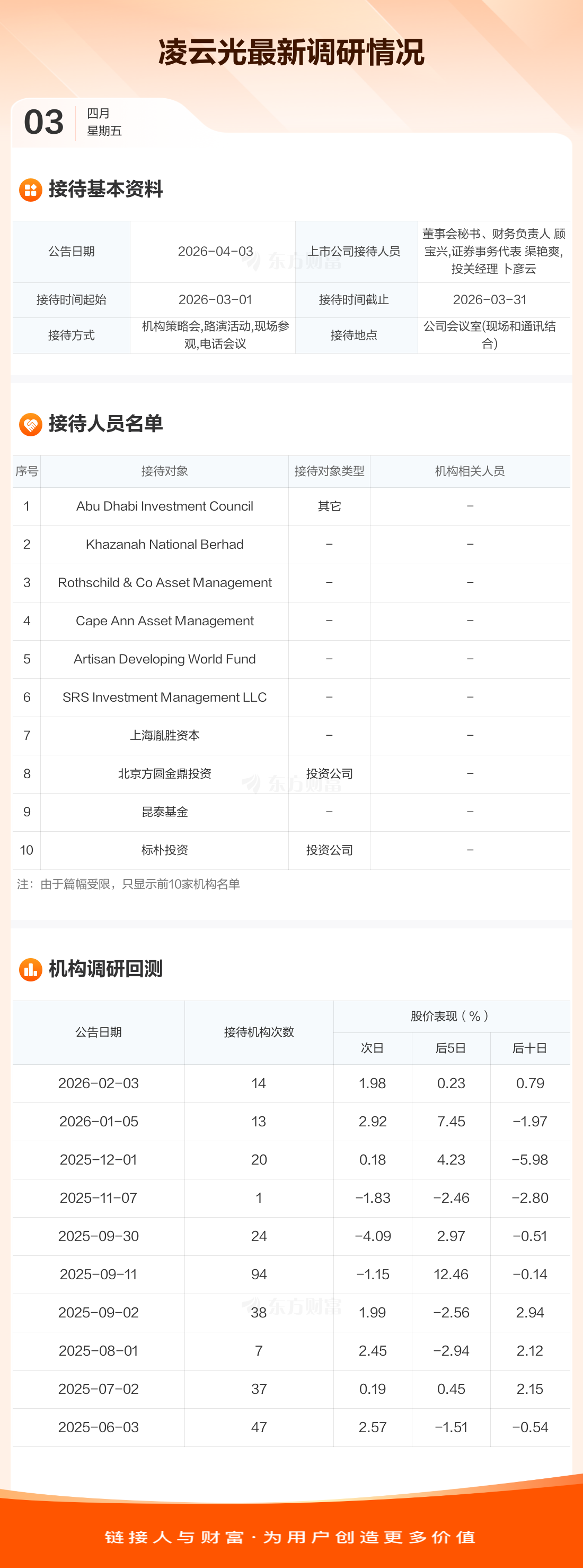 凌云光4月3日公告称,3月1日至3月31日接待Abu Dhabi Investment Council等65家机构调研。接待人员包括董事会秘书、财务负责人 顾宝兴,证券事务代表 渠艳爽,投关经理 卜彦云。