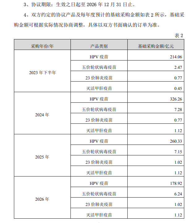 按最初约定,2023年下半年至2026年,智飞生物对HPV疫苗的基础采购金额分别为214.06亿元、326.26亿元、260.33亿元和178.92亿元。