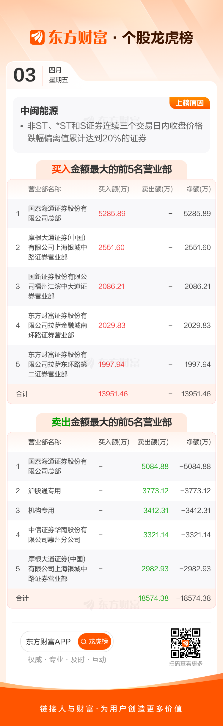 交易所2026年4月3日公布的交易公开信息显示,中闽能源因成为非ST、*ST和S证券连续三个交易日内收盘价格跌幅偏离值累计达到20%的证券上榜。中闽能源当日收报6.05元,涨跌幅-6.49%,换手率4.43%,成交额5.18亿。异常期间4月1日至4月3日,期间涨幅-20.60%,累计偏离值-20.30%,区间成交额23.33亿。