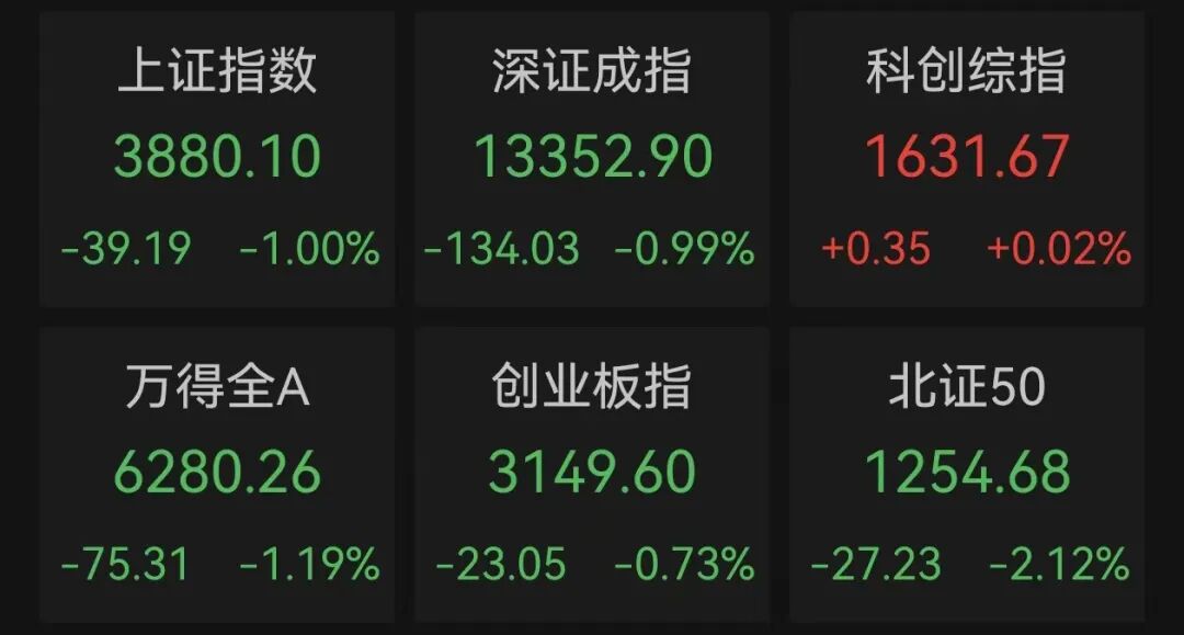 今日,A股市场震荡调整,指数分化明显。上证指数跌1%,深证成指跌0.99%,创业板指跌0.73%,科创综指微涨0.02%。全市场成交额16689亿元。