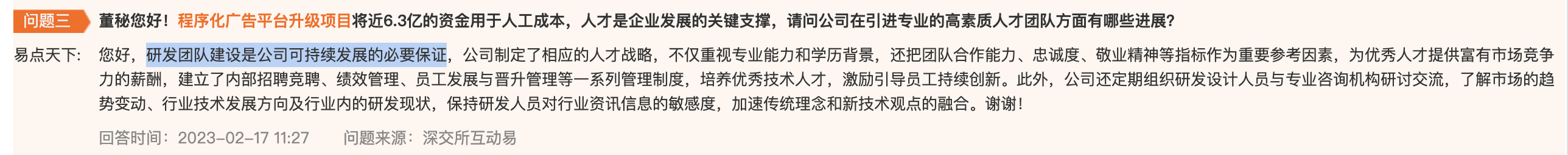 该部分资金落实在研发支出上。易点天下曾在2023年互动易上表示,募资“程序化广告平台升级项目”用于研发团队建设。称公司通过系统的研发和提升,能够提高服务客户的效率和质量,从而获得更多的广告主广告预算的订单。