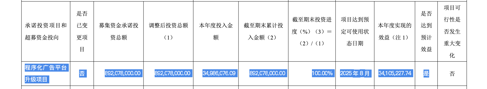 2025年报显示,“程序化广告平台升级项目”募投项目于2025年8月已经达到预定可使用状态,并且在2025年实现3411万元效益。即“竞得率大模型”已经投入产成使用。