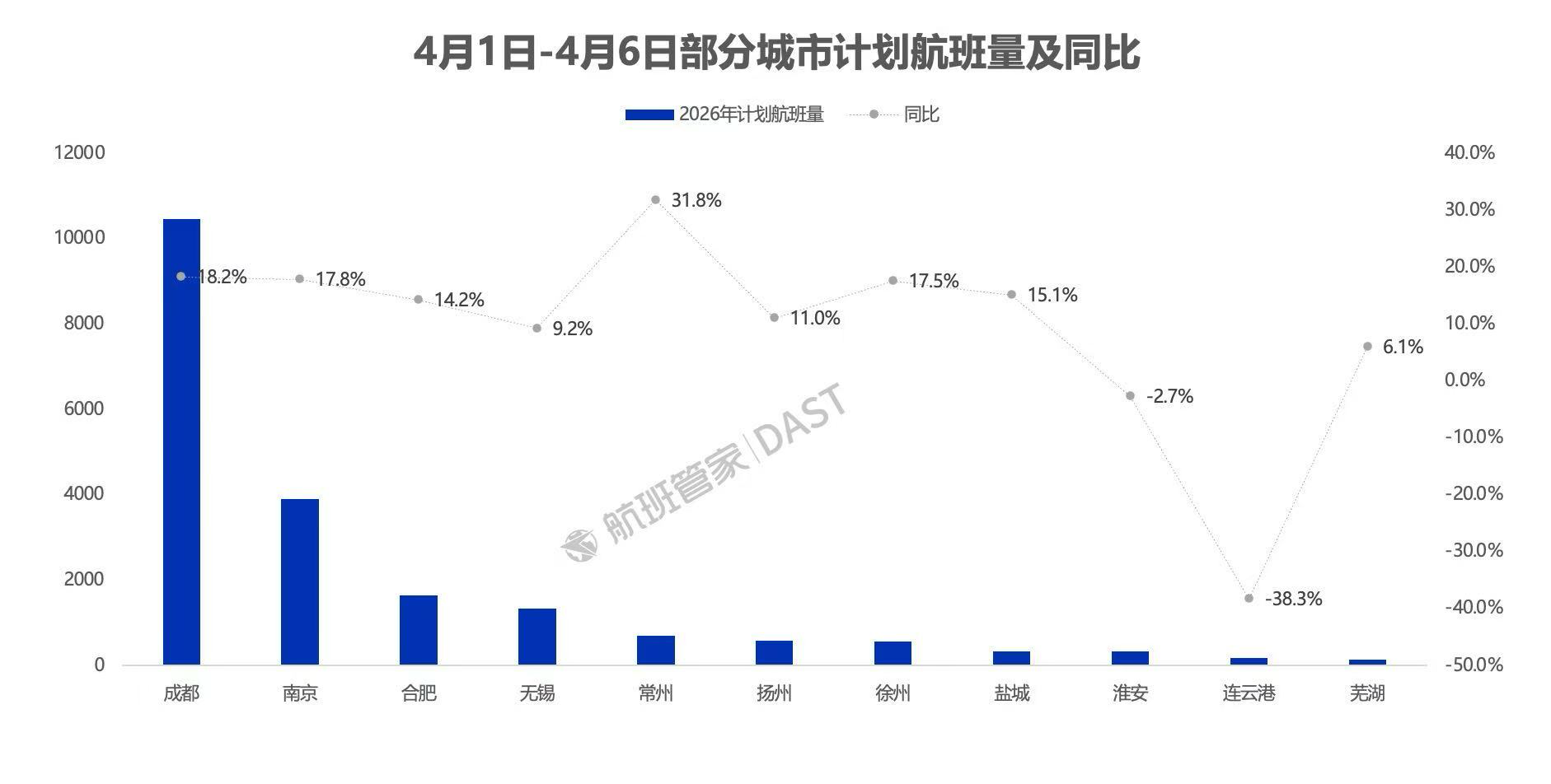 航班管家4.1-6日部分城市计划航班量数据显示,同比增幅最快的城市均为春假落地区域。