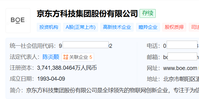 天眼查显示,京东方成立于1993年4月,注册地址位于北京市朝阳区,其A股2001年1月在深交所主板上市,B股1997年6月在深交所上市,目前形成了以半导体显示为核心,物联网创新、传感器及解决方案、MLED、智慧医工融合发展的“1+4+N+生态链”业务架构。