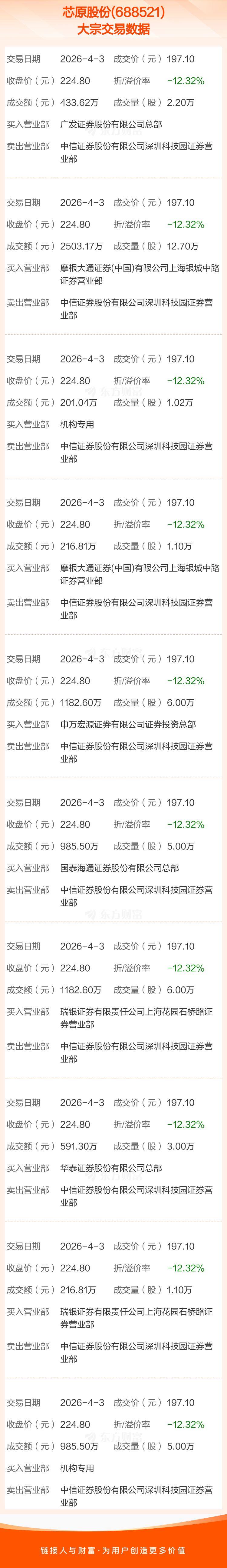 2026年4月3日,芯原股份发生10笔大宗交易,共成交43.12万股,成交金额8498.95万元,占其流通市值比例为0.07%。