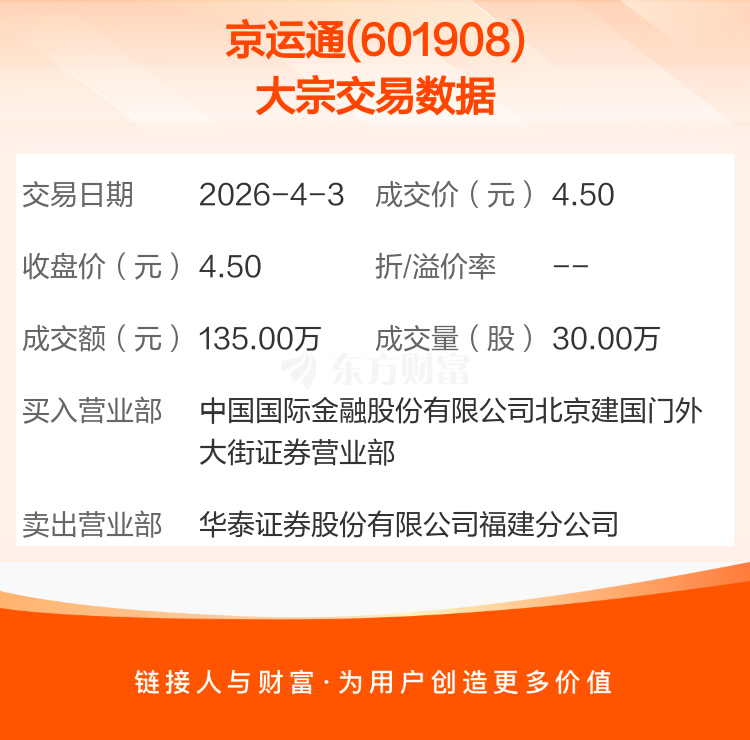 2026年4月3日,京运通发生1笔大宗交易,共成交30.00万股,成交金额135.00万元,占其流通市值比例为0.01%。