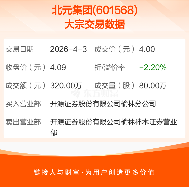 2026年4月3日,北元集团发生1笔大宗交易,共成交80.00万股,成交金额320.00万元,占其流通市值比例为0.02%。