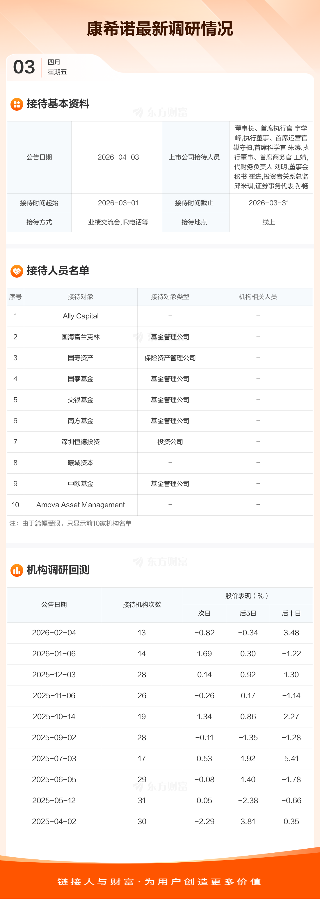 康希诺4月3日公告称,3月1日至3月31日接待Ally Capital等17家机构调研。接待人员包括董事长、首席执行官 宇学峰,执行董事、首席运营官 巢守柏,首席科学官 朱涛,执行董事、首席商务官 王靖,代财务负责人 刘明,董事会秘书 崔进,投资者关系总监 邱米琪,证券事务代表 孙畅。