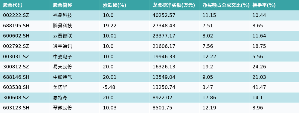 南财智讯4月3日电,盘后数据显示,因当日异动登上龙虎榜的个股中,资金净买入最多的前三位分别是福晶科技(002222.SZ)、腾景科技(688195.SH)与云赛智联(600602.SH)。其中排名第一的福晶科技净买额达4.03亿元,占总成交金额的11.15%。福晶科技当日收盘上涨10.0%,换手率为10.44%,净买入额前10个股详情见下图: