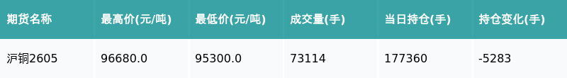 南财智讯4月3日电,盘后期货数据显示,上海期货交易所的沪铜主力合约收涨0.02%,收盘报96250.0元/吨,日内资金流出5.29亿元。其他相关指标见下表: