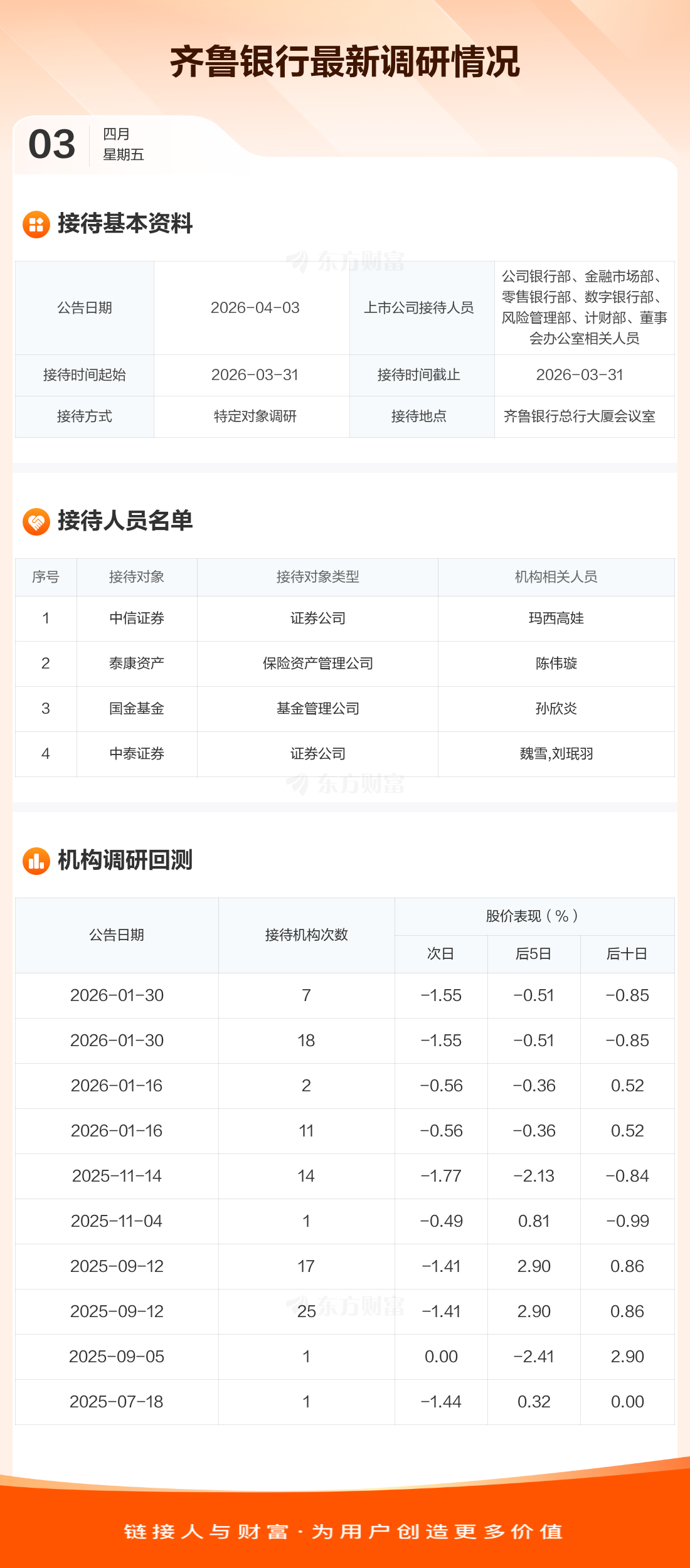 齐鲁银行4月3日公告称,3月31日接待中信证券等4家机构调研。接待人员包括公司银行部、金融市场部、零售银行部、数字银行部、风险管理部、计财部、董事会办公室相关人员。