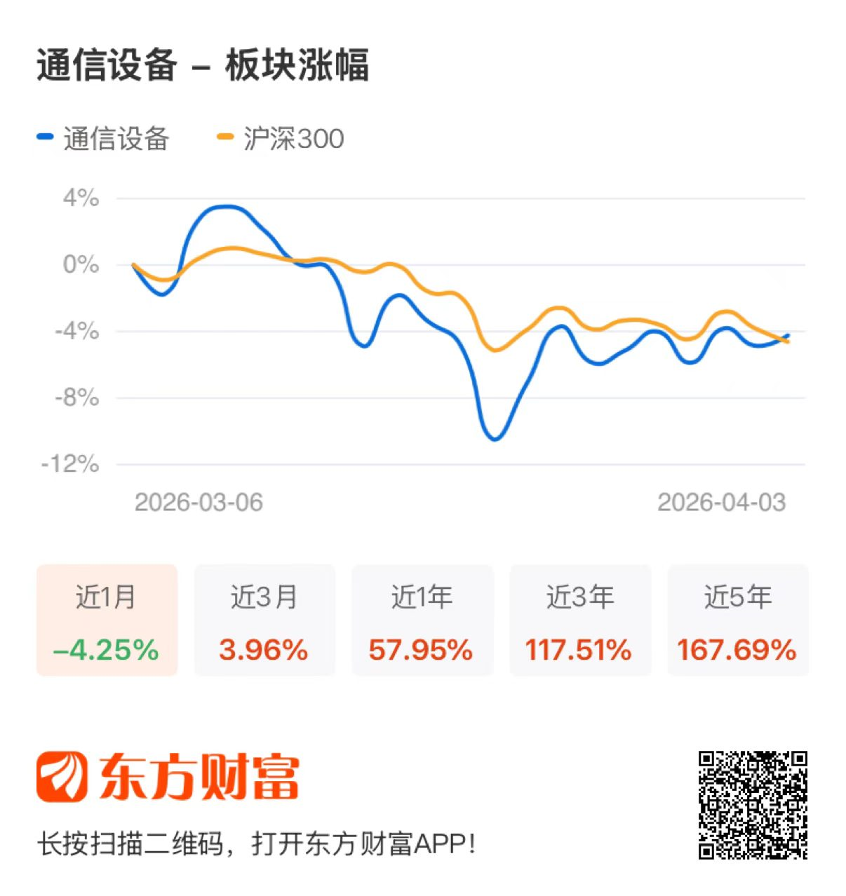 4月3日,A股三大指数今日集体回调,截止收盘,沪指跌1%,收报3880.10点;深证成指跌0.99%,收报13352.90点;创业板指跌0.73%,收报3149.60点。盘面上,通信设备行业板块涨0.7%;个股方面,德科立、汇源通信等涨停,光库科技、亨通光电等均有不同程度上涨。