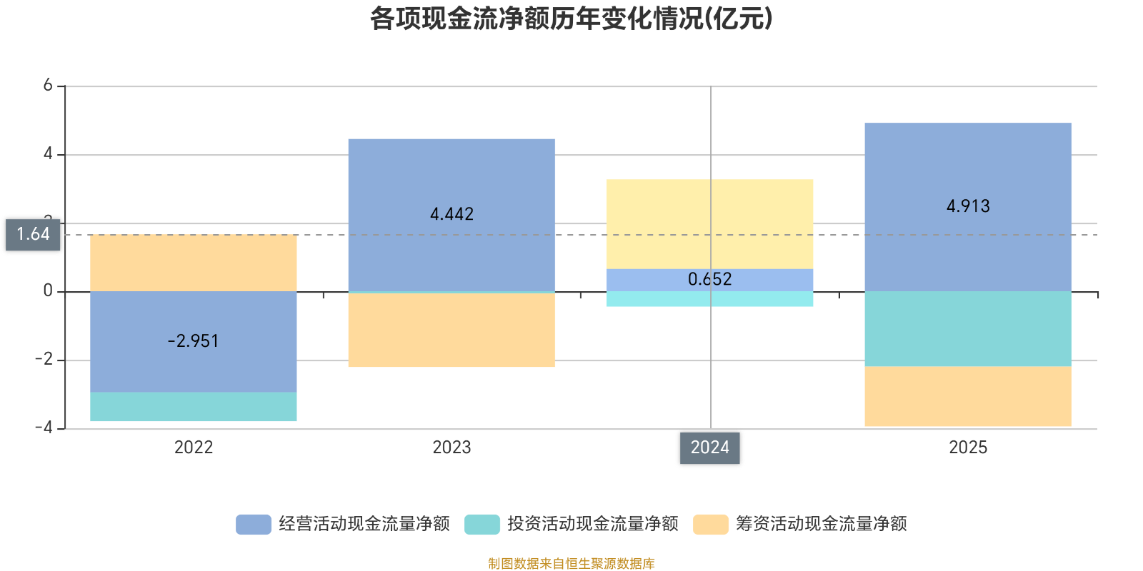 2025年,公司经营活动现金流净额为4.91亿元,同比增长653.44%;筹资活动现金流净额-1.75亿元,同比减少4.36亿元;投资活动现金流净额-2.2亿元,上年同期为-4484.6万元。