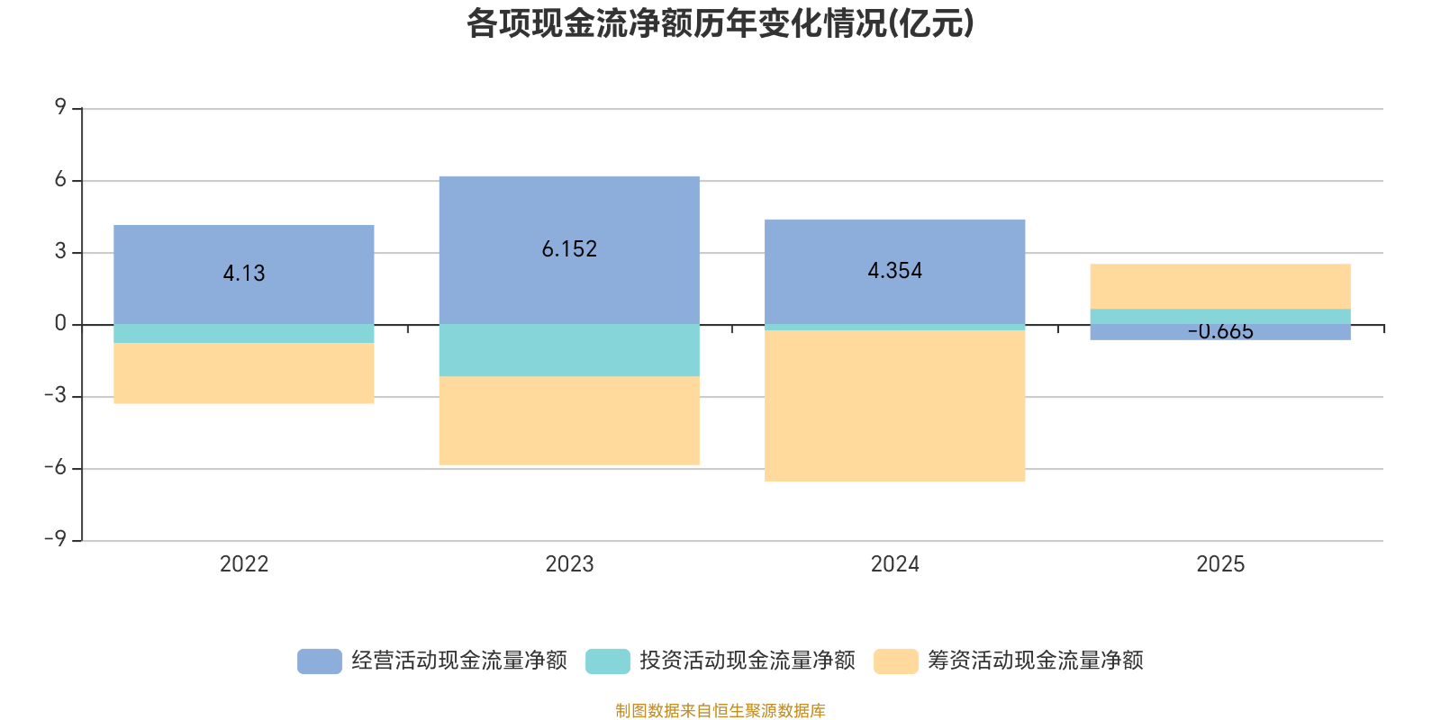 2025年,公司经营活动现金流净额为-6645.8万元,同比减少5.02亿元;筹资活动现金流净额1.88亿元,同比增加8.17亿元;投资活动现金流净额6229.4万元,上年同期为-2664.7万元。