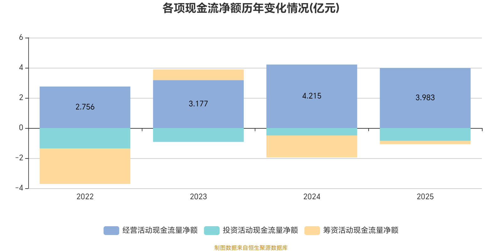 2025年,公司经营活动现金流净额为3.98亿元,同比下降5.5%;筹资活动现金流净额-2269.5万元,同比增加1.23亿元;投资活动现金流净额-8475.1万元,上年同期为-4984.8万元。