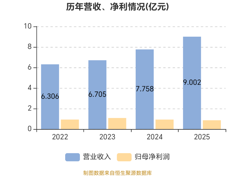 财务数据显示,2023年至2025年,公司营收分别为6.71亿元、7.76亿元、9.00亿元,保持逐年增长;同期净利润分别为1.08亿元、0.92亿元、0.86亿元,呈现小幅下滑态势。三年间毛利分别为3.58亿元、4.26亿元、4.76亿元,毛利率维持在52%以上,2025年受槟城生产基地投产及原材料价格上涨影响,毛利率较上年有所回落。研发投入持续增加,2025年研发费用达2.26亿元,占营收比例超25%,重点投入高性能数字示波器、微波射频仪器等核心产品技术迭代。