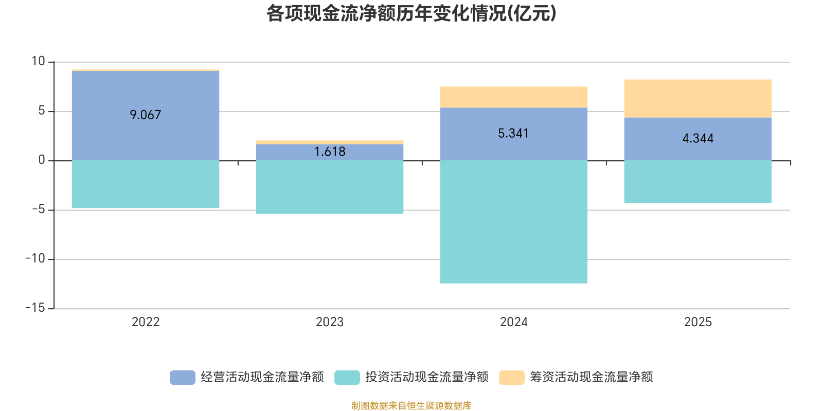 2025年,公司经营活动现金流净额为4.34亿元,同比下降18.68%;筹资活动现金流净额3.85亿元,同比增加1.71亿元;投资活动现金流净额-4.33亿元,上年同期为-12.48亿元。
