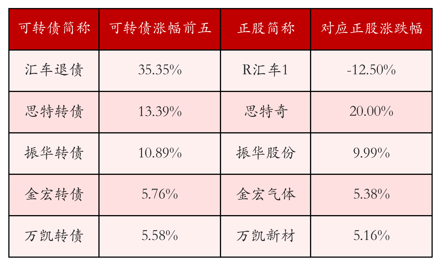 南财智讯4月3日电,盘后数据显示,债市方面,中证转债指数收涨0.14%,报491.07,成交额为631.84亿元。可转债方面,今日共成交344只可转债,其中193只收涨,1只收平,150只收跌。具体来看,22只可转债涨幅超过2%。其中汇车退债(404004)涨35.35%,思特转债(123054)涨13.39%,振华转债(113687)涨10.89%。今日有9只可转债跌幅超2%,新港转债(111013)跌7.97%,塞力转债(113601)跌6.25%,恒帅转债(123256)跌5.87%。存在交易量的可转债所对应的正股中,52只收涨,2只收平,290只收跌。具体来看,12只可转债对应正股涨幅超过5%,其中,思特奇(300608)涨停,收涨20.0%;苏利股份(603585)涨停,收涨10.01%;振华股份(603067)涨停,收涨9.99%。同时所对应的可转债:思特转债(123054)同涨13.39%;苏利转债(113640)同涨5.37%;振华转债(113687)同涨10.89%。今日有23只可转债对应正股跌幅超过5%,R汇车1(400245)跌停,收跌12.5%。同时所对应的可转债:汇车退债(404004)反涨35.35%。