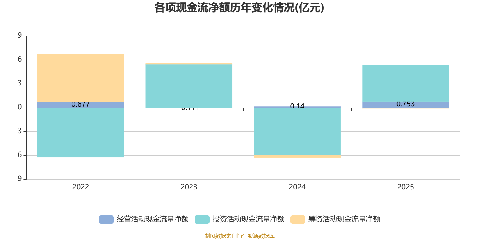 2025年,公司经营活动现金流净额为7531.4万元,同比增长436.08%;筹资活动现金流净额-1241.8万元,同比增加1797万元;投资活动现金流净额4.6亿元,上年同期为-5.99亿元。