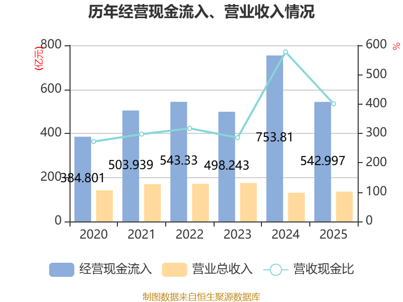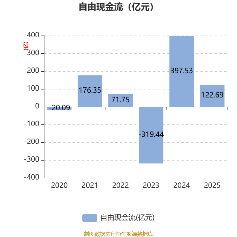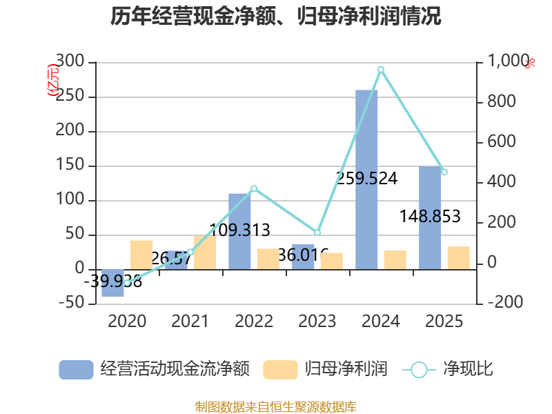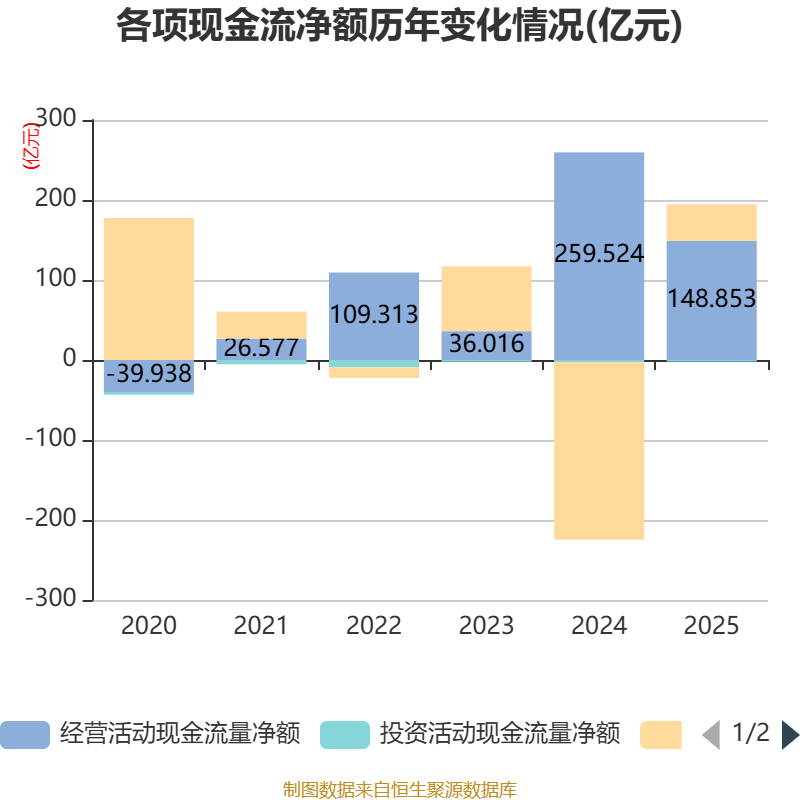 截至2025年,公司经营活动现金流净额为148.85亿元,同比下降42.64%;筹资活动现金流净额45.64亿元,同比增加267.44亿元;投资活动现金流净额-1.97亿元,上年同期为-2.89亿元。