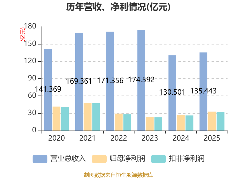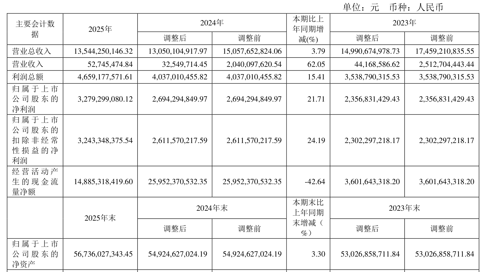中证智能财讯国投资本(600061)4月3日披露2025年年度报告。2025年,公司实现营业总收入135.44亿元,同比增长3.79%;归母净利润32.79亿元,同比增长21.71%;扣非净利润32.43亿元,同比增长24.19%;经营活动产生的现金流量净额为148.85亿元,同比下降42.64%;报告期内,国投资本基本每股收益为0.5元,加权平均净资产收益率为6.08%。公司2025年度分配预案为:拟向全体股东每10股派现1.55元(含税)。