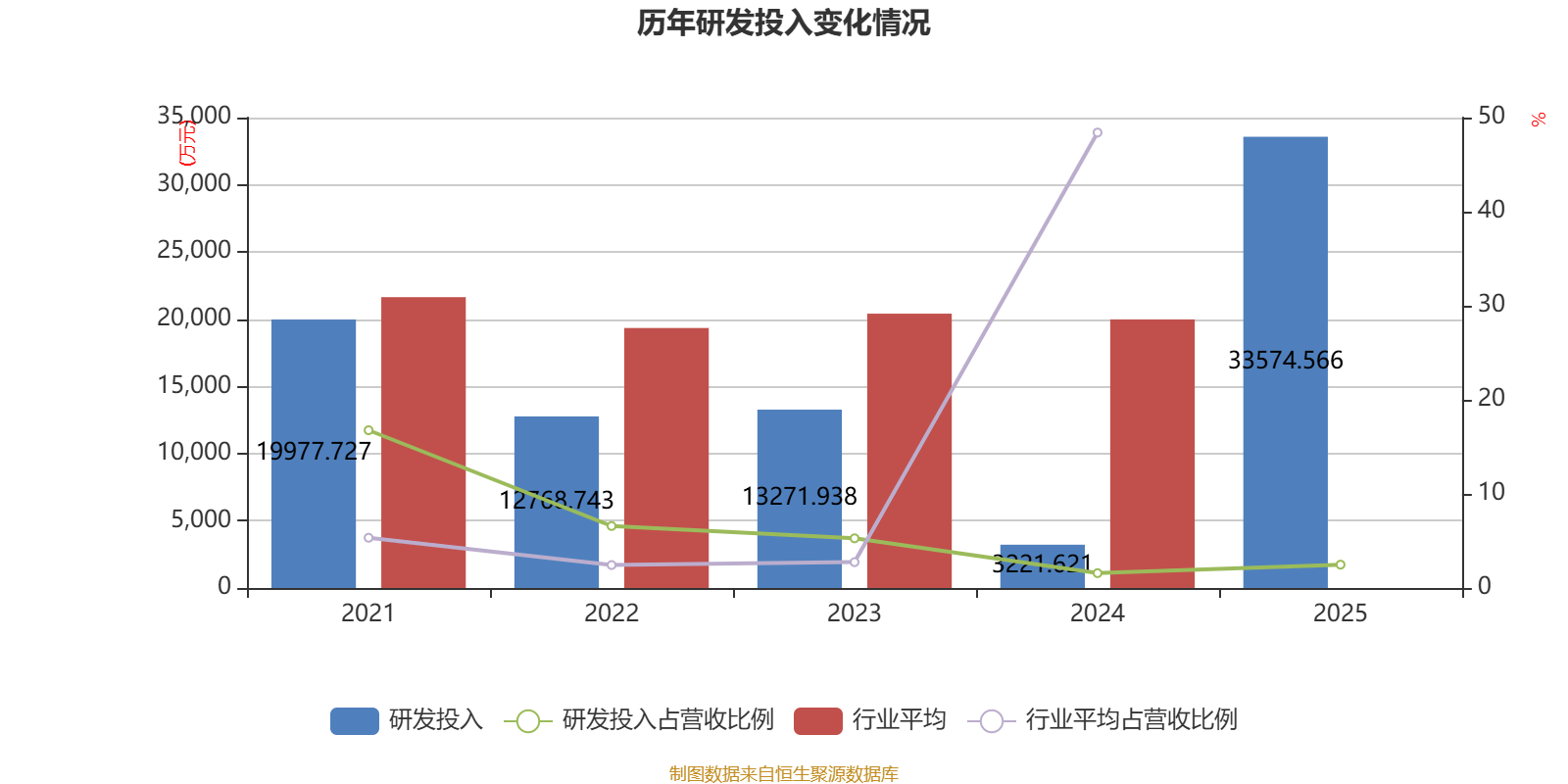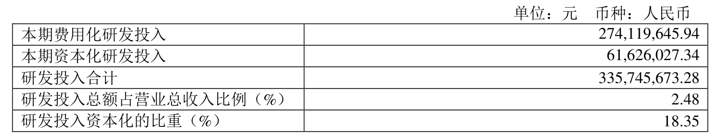 2025年全年,公司研发投入金额为3.36亿元,同比增长942.16%;研发投入占营业收入比例为2.48%,相比上年同期上升0.9个百分点。此外,公司全年研发投入资本化率为18.35%。