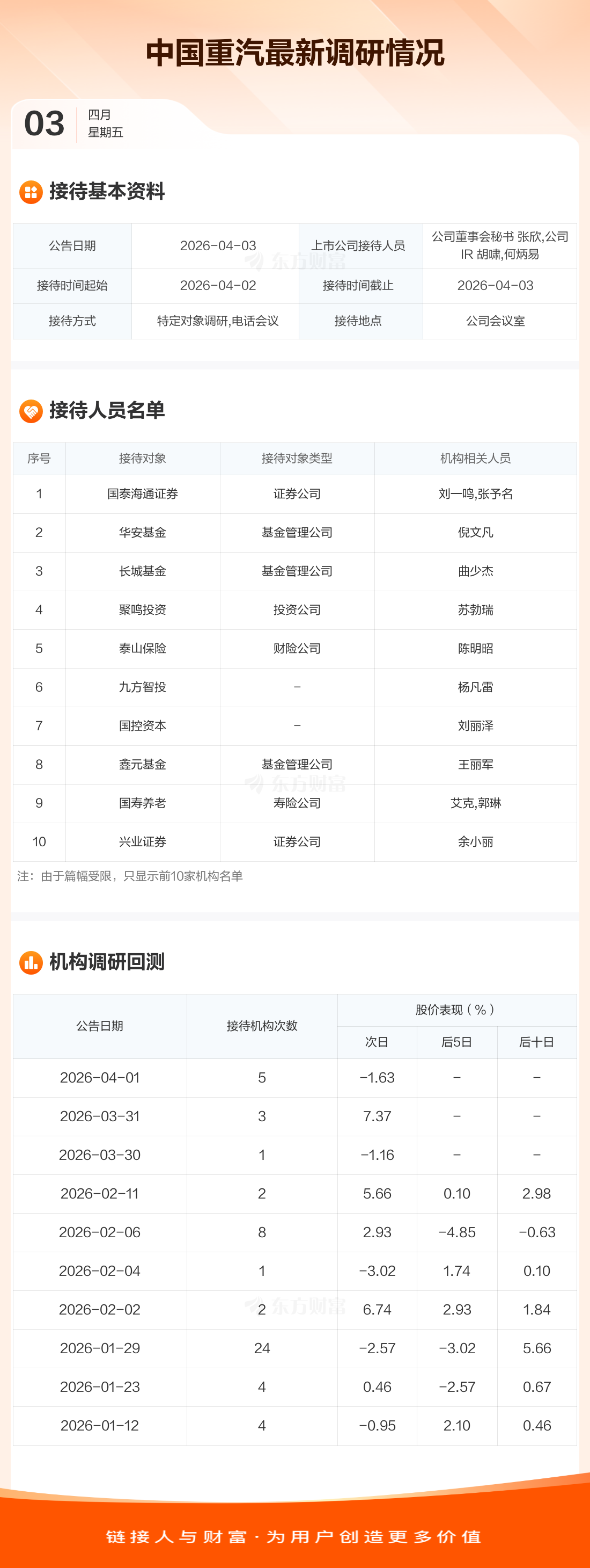 中国重汽4月3日公告称,4月2日至4月3日接待国泰海通证券等16家机构调研。接待人员包括公司董事会秘书 张欣,公司IR 胡啸,何炳易。