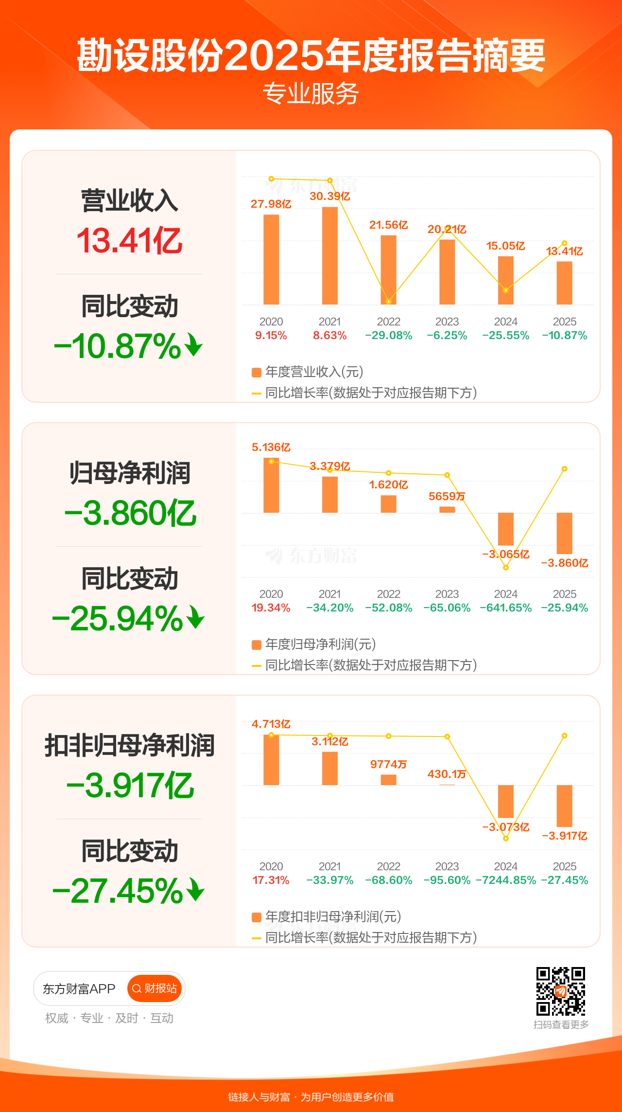 勘设股份4月4日发布2025年年报显示,公司全年实现营业收入13.41亿元,同比下滑10.87%;归母净利润-3.86亿元;扣非归母净利润-3.92亿元。
