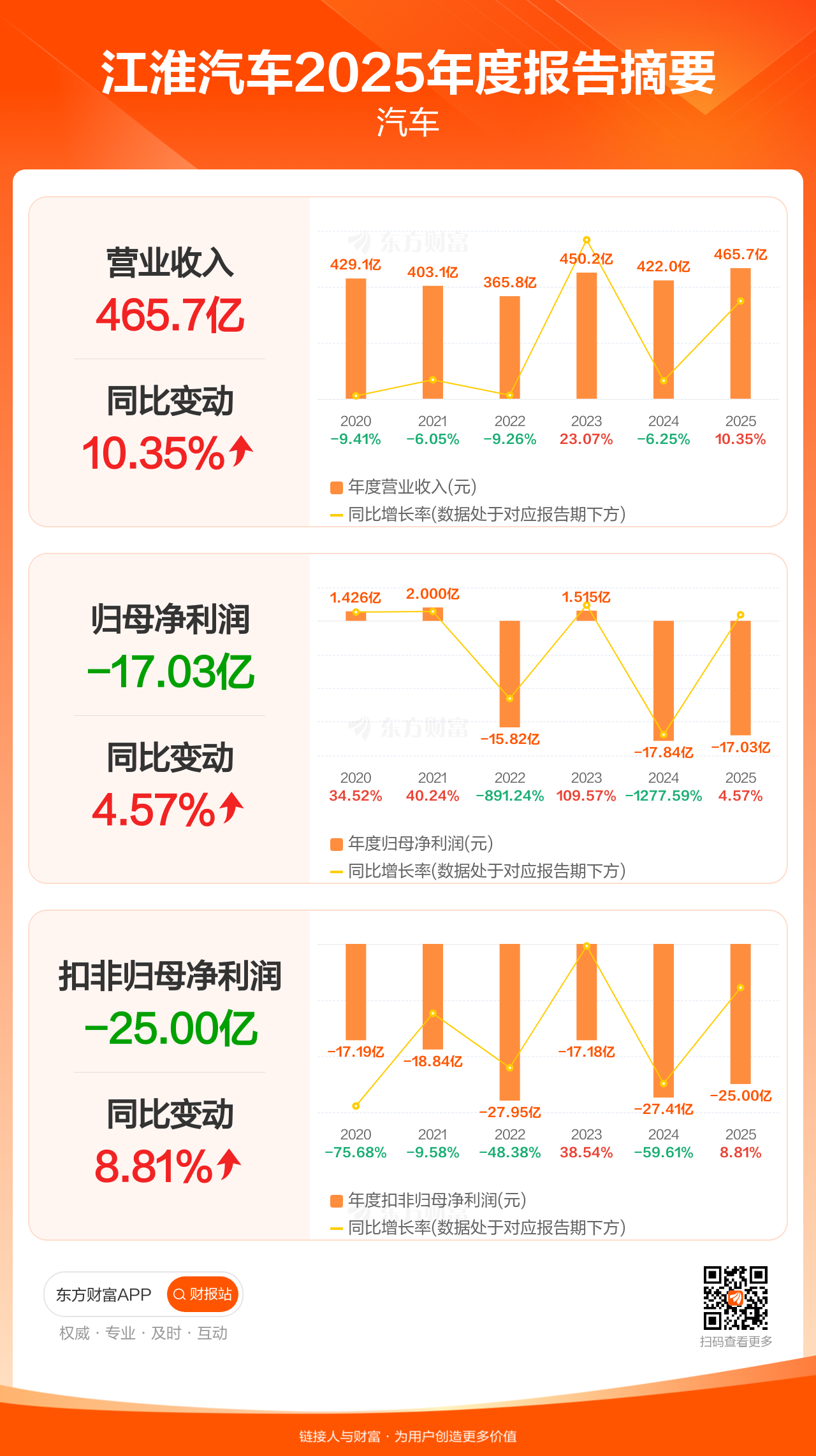 江淮汽车4月4日发布2025年年报显示,公司全年实现营业收入465.69亿元,同比增长10.35%;归母净利润-17.03亿元;扣非归母净利润-25.00亿元。