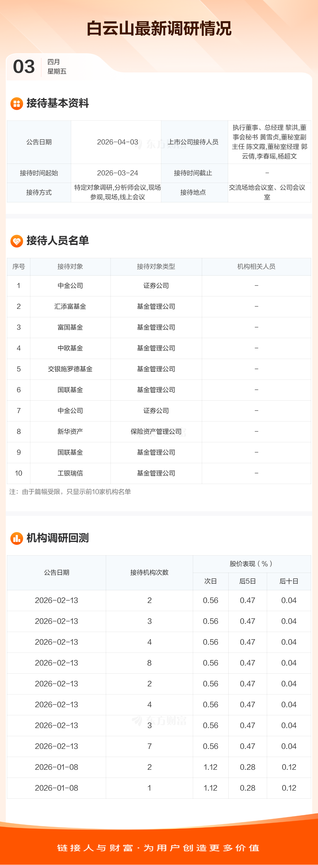 白云山4月3日公告称,3月24日接待中金公司等16家机构调研。接待人员包括执行董事、总经理 黎洪,董事会秘书 黄雪贞,董秘室副主任 陈文霞,董秘室经理 郭云倩,李春瑶,杨超文。