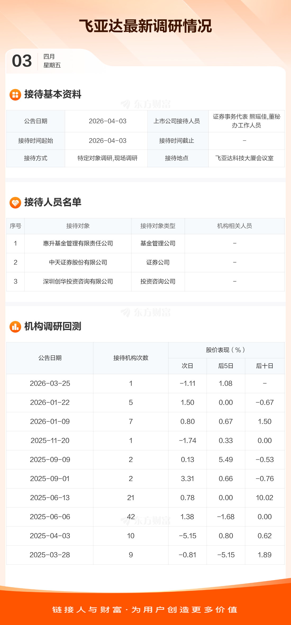 飞亚达4月3日公告称,4月3日接待惠升基金管理有限责任公司等3家机构调研。接待人员包括证券事务代表 熊瑶佳,董秘办工作人员。