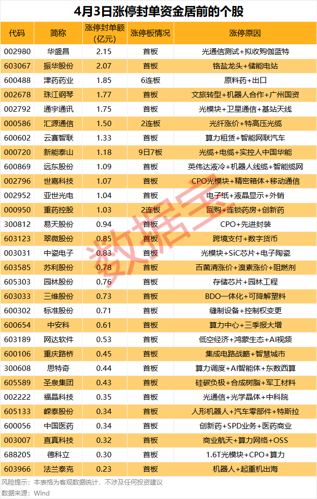 从连续涨停天数看,津药药业已连收6个涨停板,连续涨停板数量最多。以封单金额计算,12股封单均超1亿元,华盛昌、振华股份、津药药业等涨停板封单资金居前,分别有2.15亿元、2.07亿元、1.85亿元。