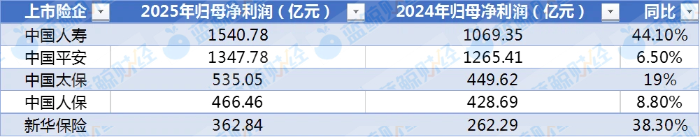 其中,中国人寿2025年归母净利润同比大增44.1%至1540.78亿元;中国平安归母净利润为1347.78亿元,同比增长6.5%;中国太保、中国人保、新华保险分别实现归母净利润535.05亿元、466.46亿元及362.84亿元,对应增幅分别为19%、8.8%及38.3%。
