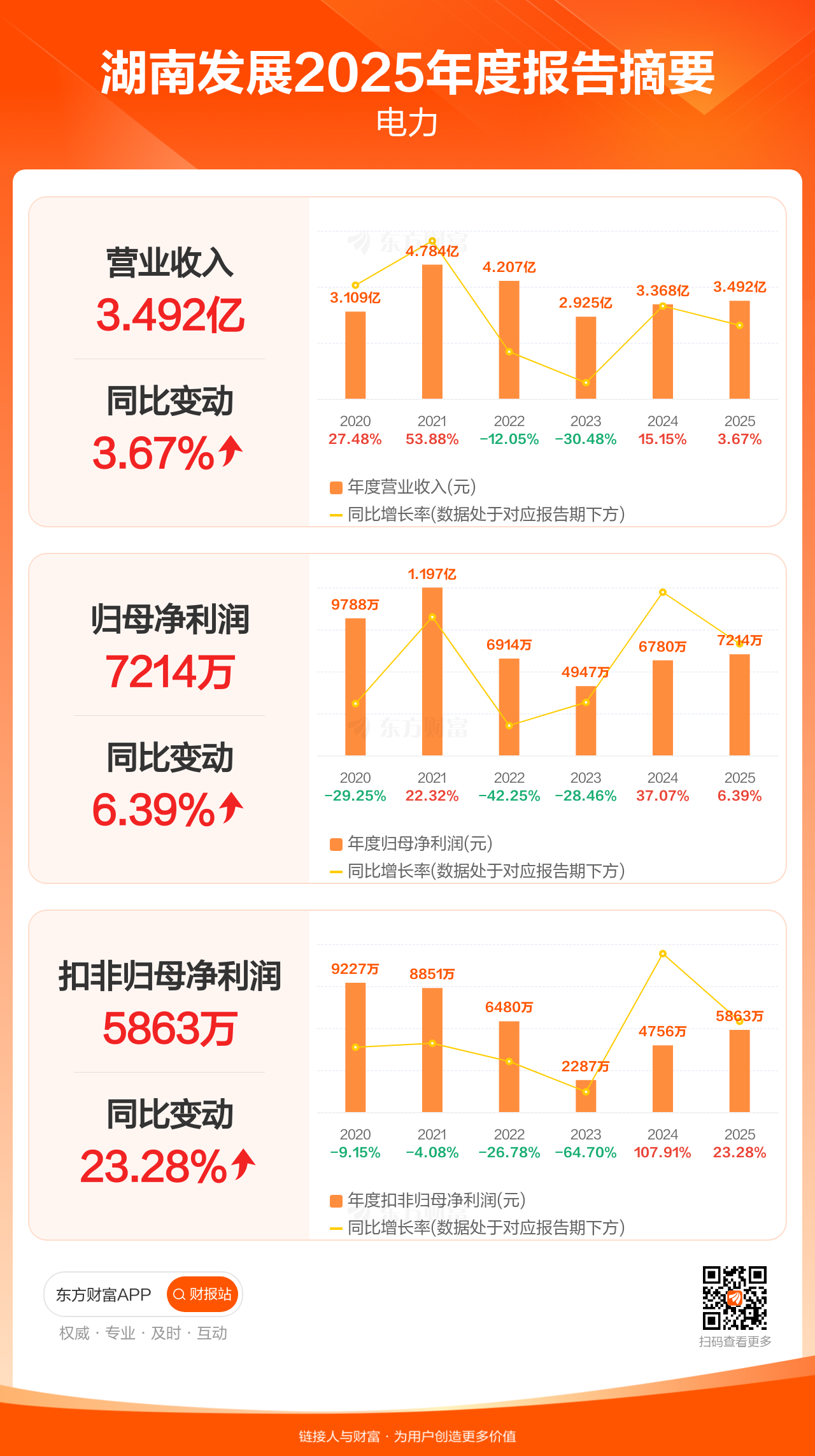 湖南发展4月4日发布2025年年报显示,公司全年实现营业收入3.49亿元,同比增长3.67%;归母净利润7213.78万元,同比增长6.39%;扣非归母净利润5862.65万元,同比增长23.28%。