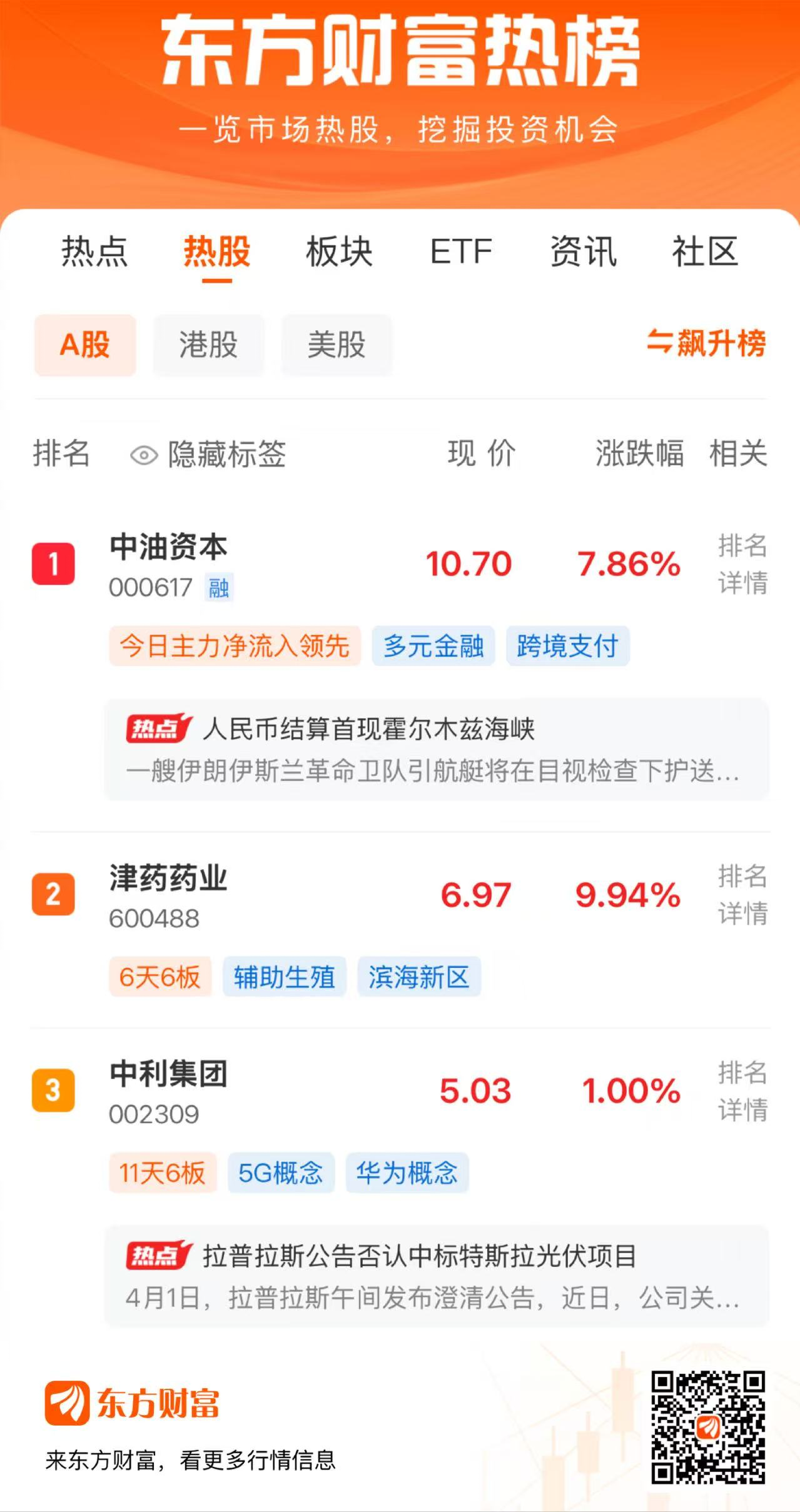 4月3日,两市震荡调整,三大指数均跌约1%。东方财富热榜前三的股票中,中油资本位列第1,津药药业位列第2,中利集团位列第3。